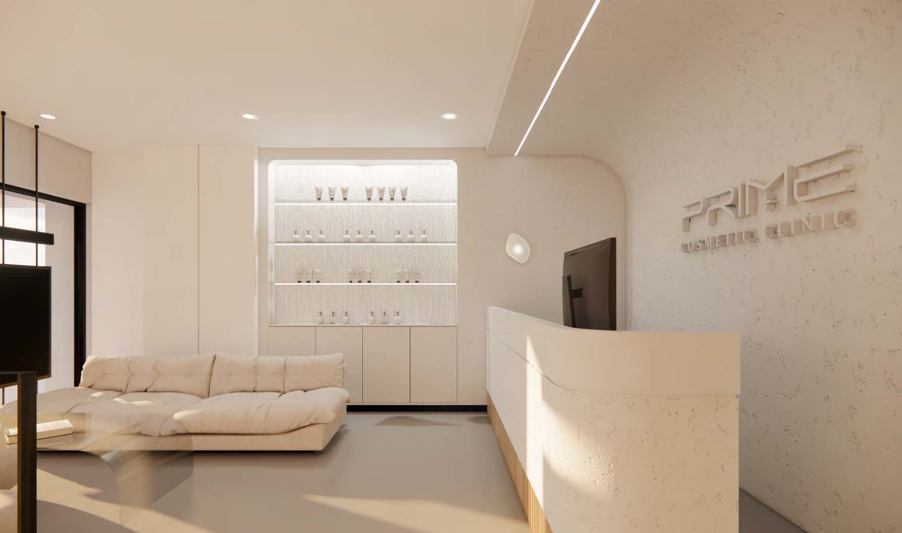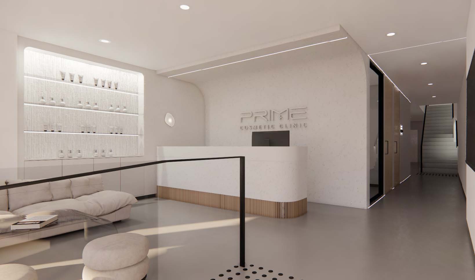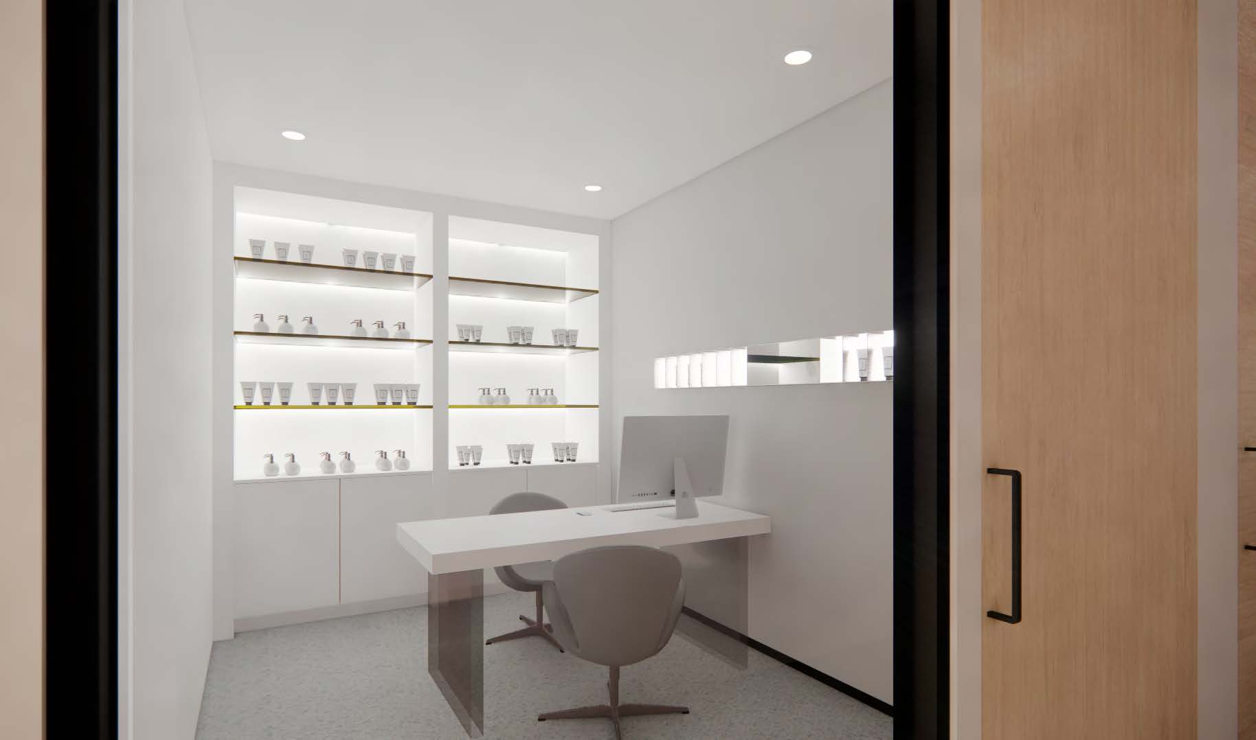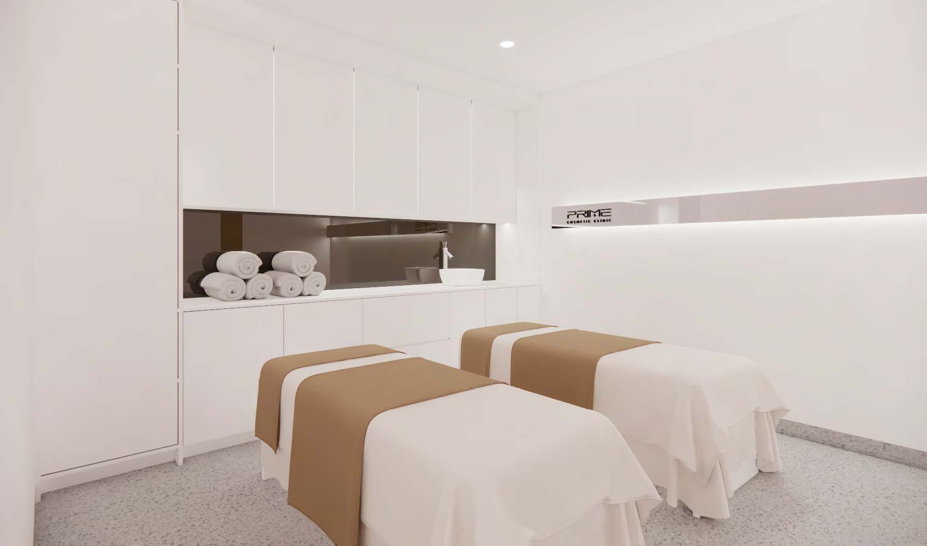 The simplicity of the floor plan and the crisp colour palette create a clean and inviting atmosphere for the visitors, seeking cosmetic and aesthetic services.