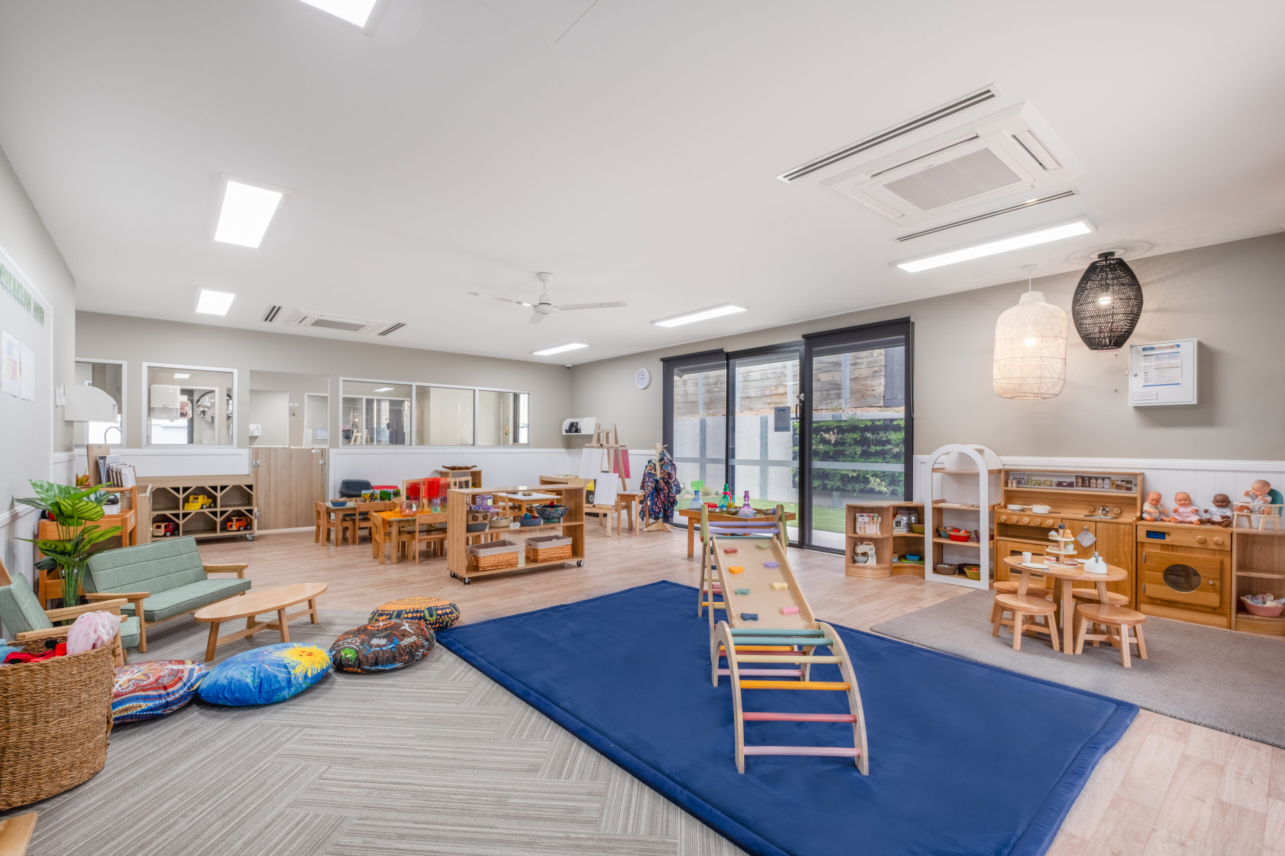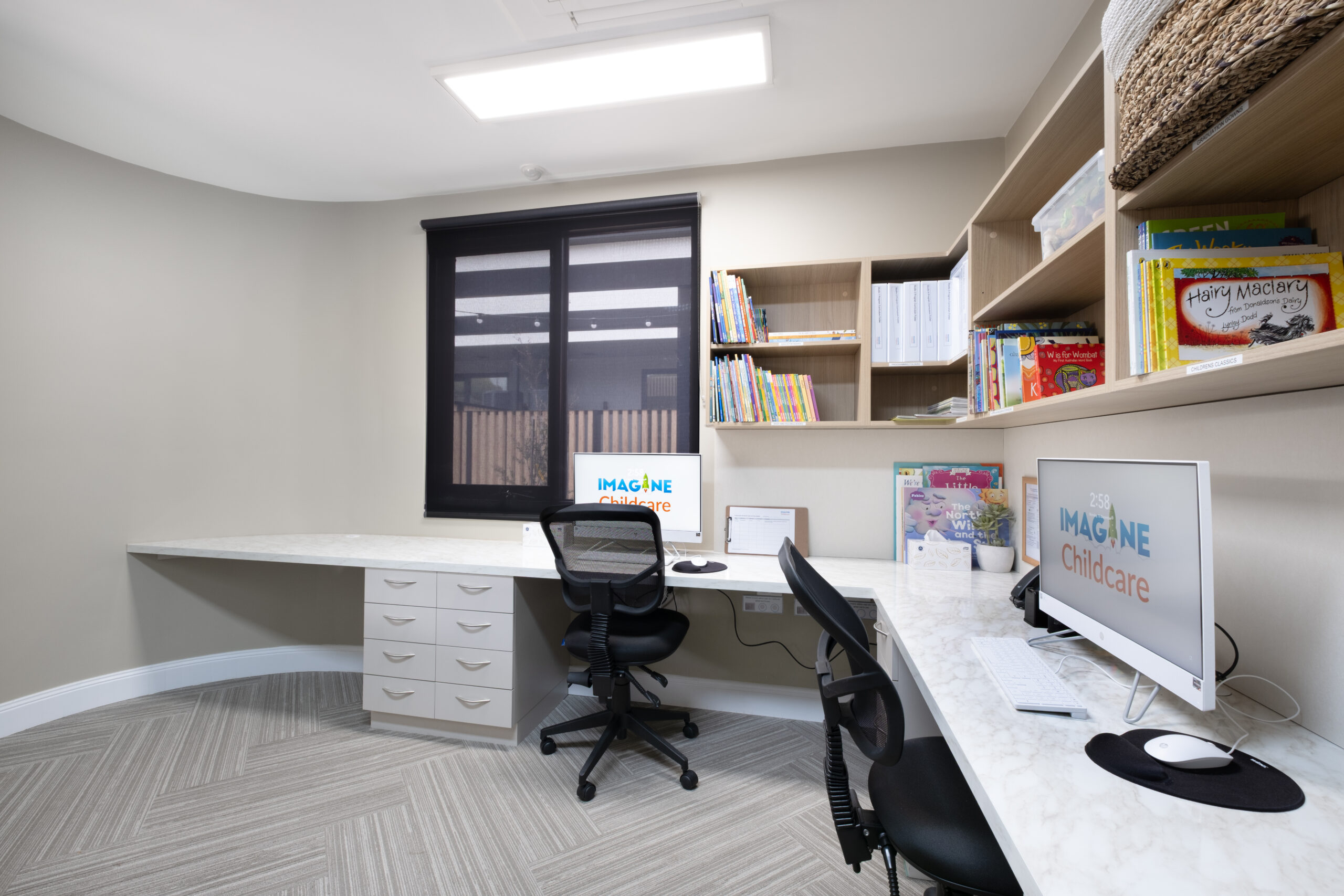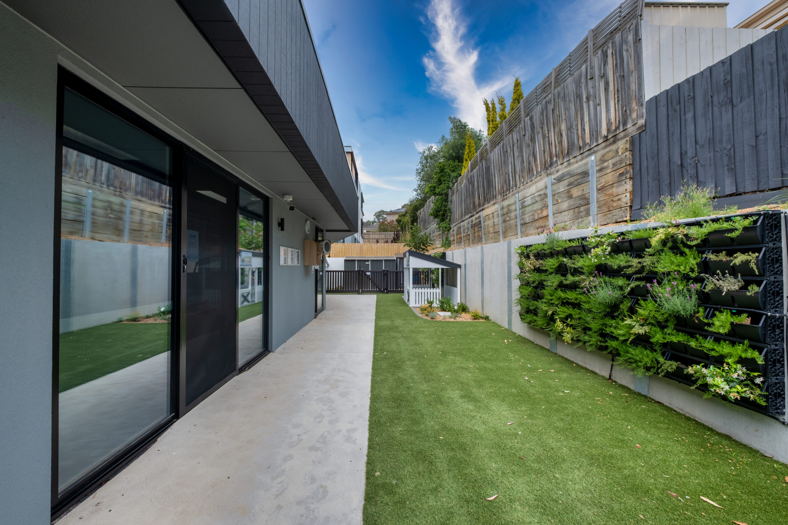 Light, neutral colours tones ,  with plenty of white tones and varying grey tones , compliments nicely to the timber finishes, and giving the development a contemporary and elegant design.  The curved profile of the childcare , and large glazing lifts the design barre of this development to another level in Templestowe lower.