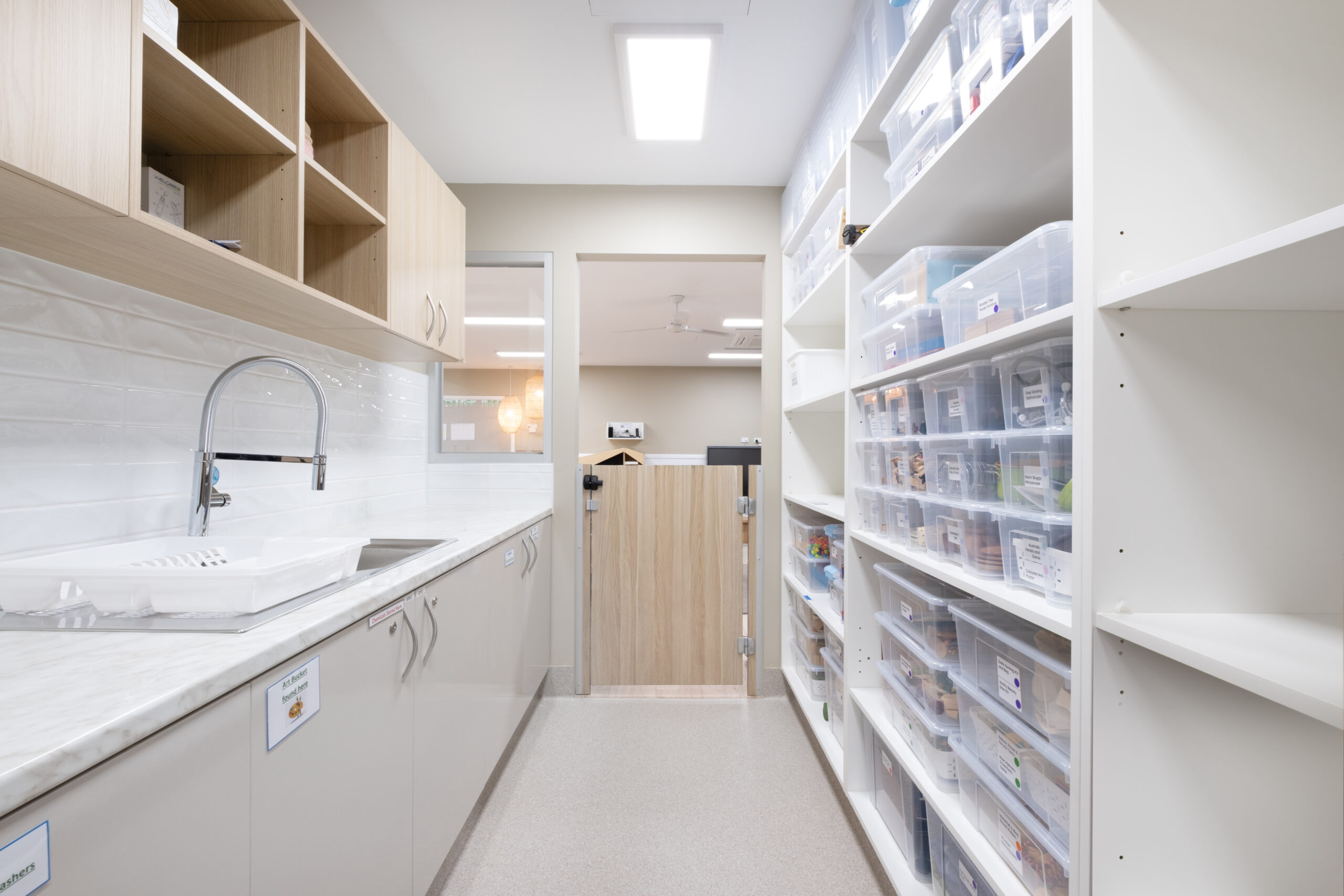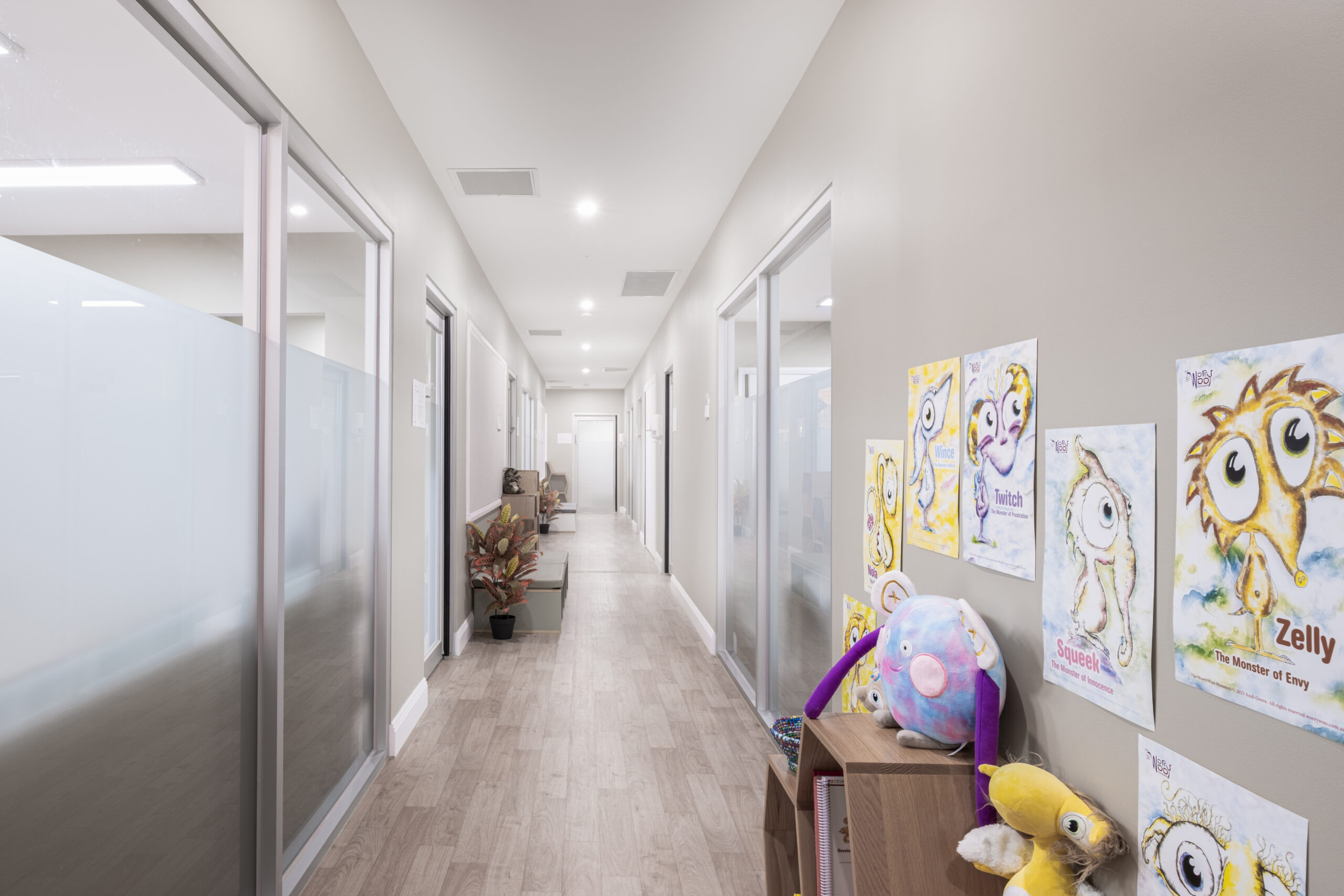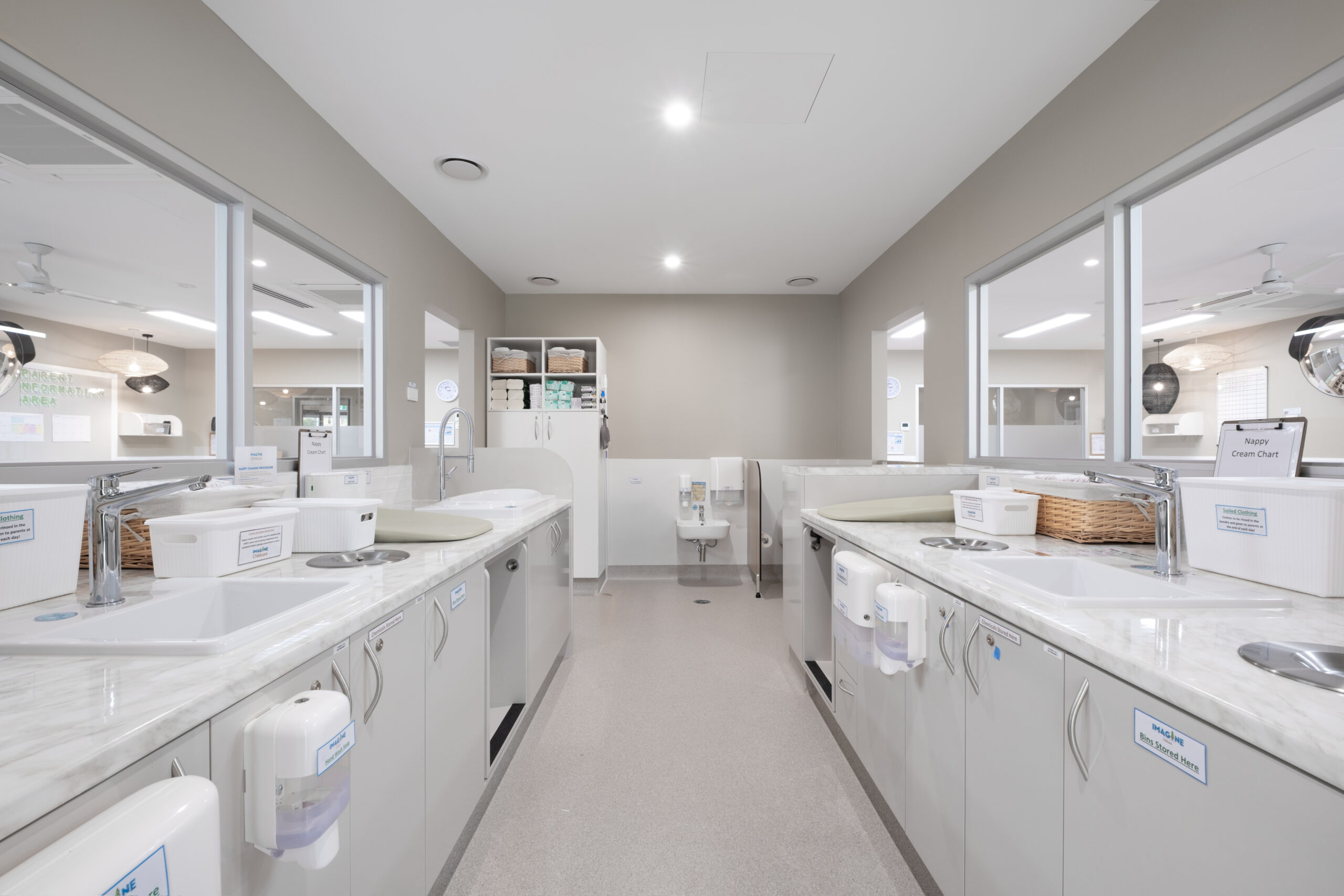 Light, neutral colours tones ,  with plenty of white tones and varying grey tones , compliments nicely to the timber finishes, and giving the development a contemporary and elegant design.  The curved profile of the childcare , and large glazing lifts the design barre of this development to another level in Templestowe lower.